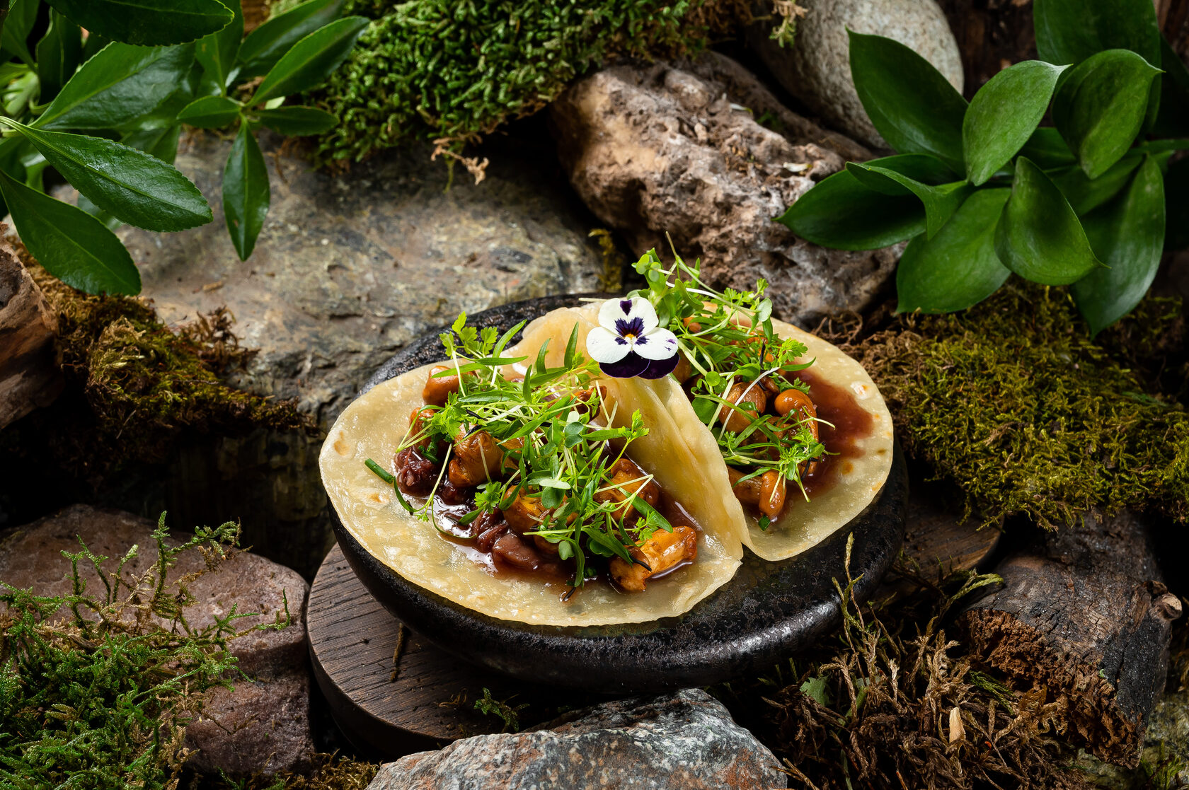 Злаковая булочка со взбитым маслом, копчёной сольюи пудрой из мухомора